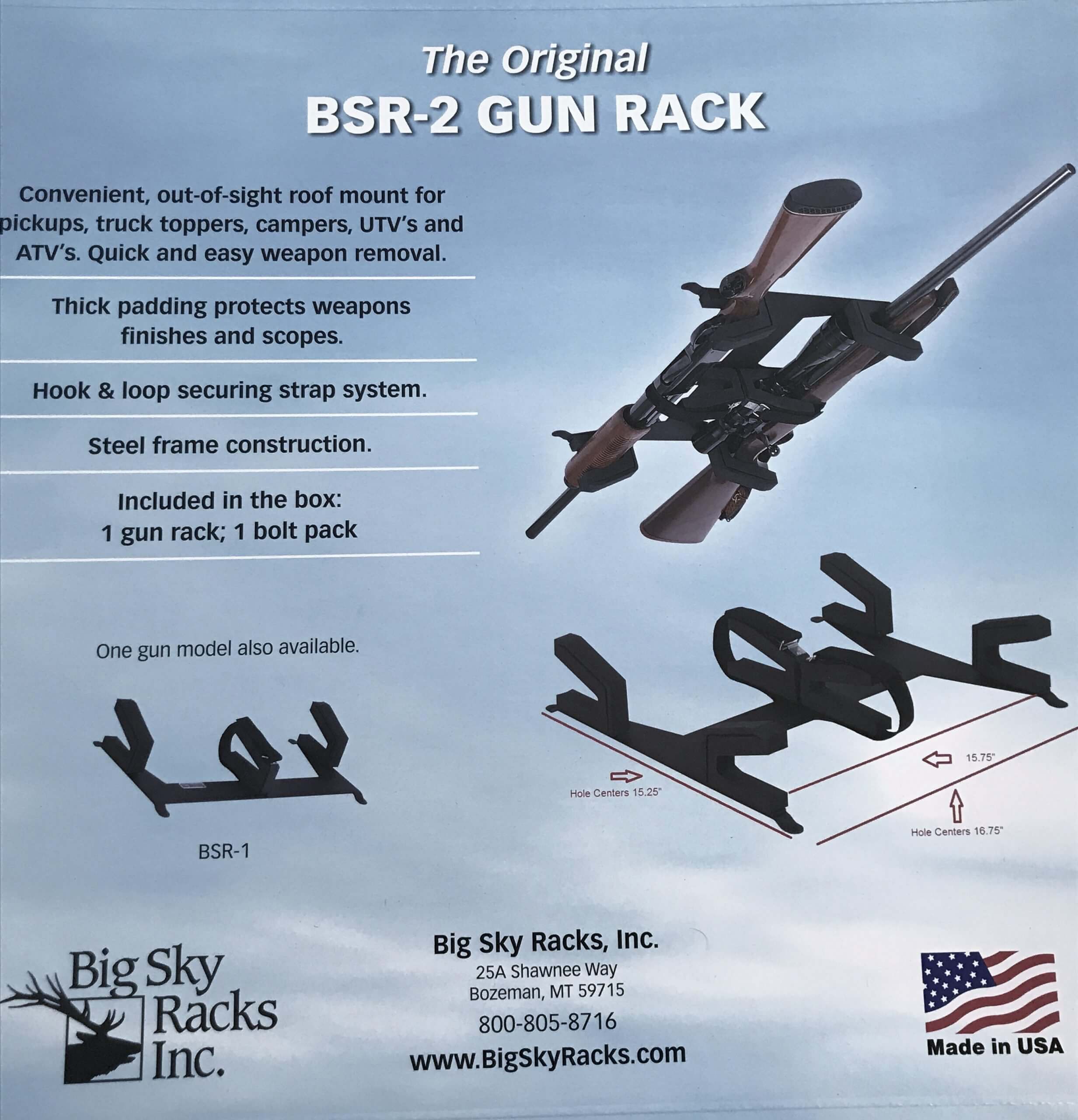 BSR – 2G, this Big Sky Rack model is engineered to keep rifles secure, easy to access, and compact. For flat surface mount applications, including older double roof pickup trucks, UTV canopy tops, tractor cabs, pickup toppers, golf carts and through the roof installation on newer pickups. Mounting hole dimensions are 16.75″ w. x 15.25″ h.